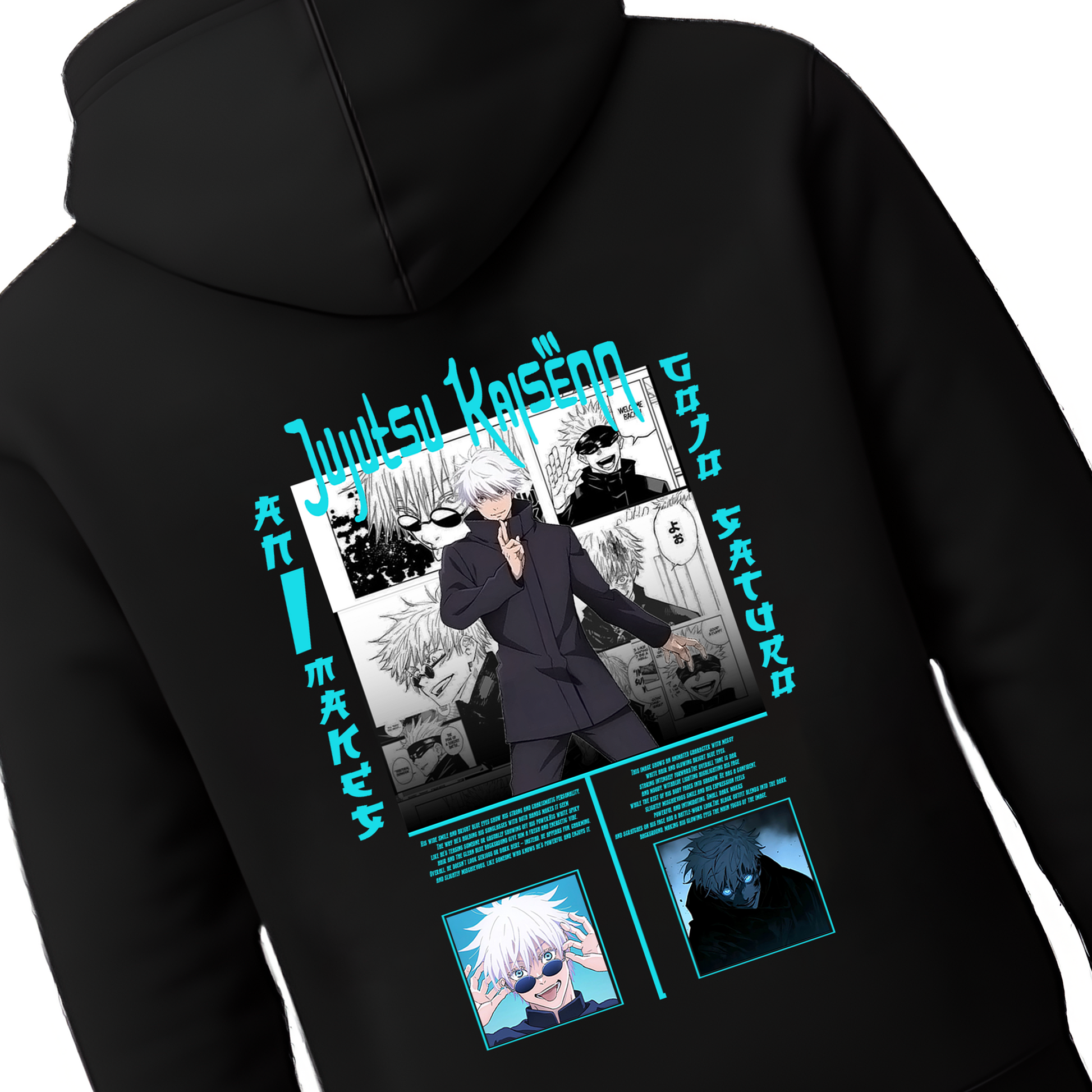 The deep black base creates the perfect canvas for the striking teal typography and layered manga panels. The full-body Gojo artwork stands powerful at the center, surrounded by classic manga frames that amplify the intensity. Vertical Japanese text elements add an authentic anime aesthetic, while the dual lower portraits complete the statement look.